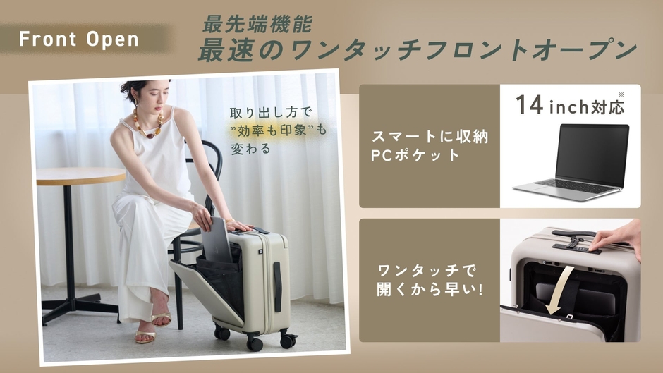 スーツケースを寝かせる必要がなく、移動中でもPCや書類をサッと取り出せる快適設計。混雑した駅や空港でもモタつかず、必要な物をすぐ扱えるため、時間のない移動シーンでも体感的な“速さ”を実感できます。さらにPCポケットや収納に便利な複数の仕切りで整理が簡単になり、追加バッグ要らずのスマートな移動も可能です。