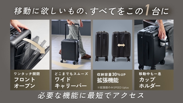 こうした声に応え、 “移動ストレスの徹底削減” をテーマに新モデルを企画しました。フロントオープンで取り出しやすい「SPEED U」、約30%拡張で荷物の増減に対応する「SPEED U plus」。どちらもビジネスから旅行まで幅広いシーンで快適に使え、移動の“スピード”と“便利さ”を両立しています。