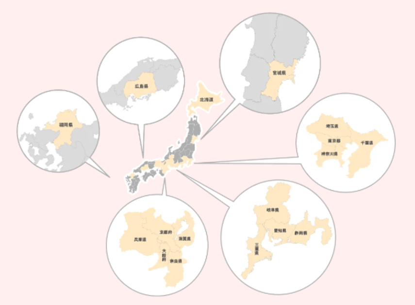 北海道・宮城県・東京都・神奈川県・埼玉県・千葉県・愛知県・三重県・岐阜県・静岡県・大阪府・京都府・兵庫県・奈良県・滋賀県・広島県・福岡県・一部除外あり