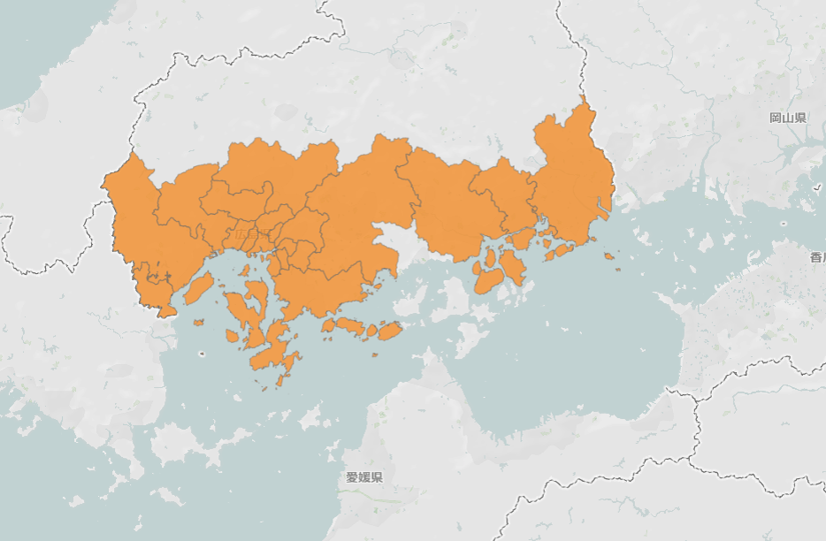 広島市中区、広島市東区、広島市南区、広島市西区、広島市安佐南区、広島市安佐北区、広島市安芸区、広島市佐伯区、呉市、三原市、尾道市、福山市、大竹市、東広島市、廿日市市、江田島市、府中町、海田町、熊野町、坂町