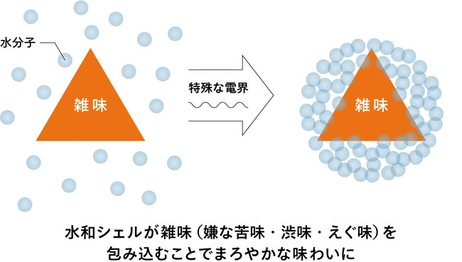 専用デバイスは、特殊な電界を発生させます。 特殊な電界が雑味(嫌な苦味・渋味・えぐ味)に影響を与えて、水和シェルを形成。 この水和シェルが雑味を包み込むことでまろやかな味わいになり、また同時に、コーヒー本来の旨味や甘味、香りを際立たせます。