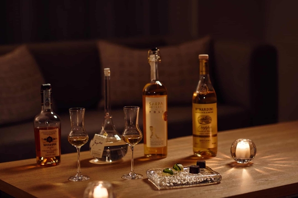 ディナーの後は、アルフレスコのリビングで、贅沢に過ごすディジェスティフが楽しめます。ディジェスティフには、ワインを造る際に生まれる葡萄の果皮や種子を発酵、蒸留して造るグラッパと、ドメーヌ ミエ・イケノのワインを使ったボンボンショコラを用意。ボンボンショコラは果実味と酸味のバランスがとれた味わいが特徴です。グラッパとオリジナルのボンボンショコラで、食後の余韻に浸る贅沢なひとときを過ごせます。