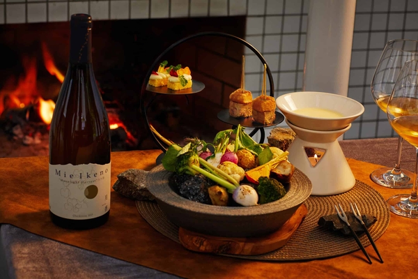 自然を豊かに感じられる場所「アルフレスコ」のデッキで暖炉を囲みながら、アペリティフを楽しめます。食前酒には、希少な「Mie Ikeno 月香シャルドネ2017」と自然の恵みを活かした3品の料理を用意しました。「Mie Ikeno 月香シャルドネ2017」は、凝縮された果実味とストレートな酸味に、キレのあるミネラルのタッチが特徴の表情豊かな白ワインです。料理は、温かいチーズとともに味わう「ロースト野菜のフォンデュータ」やイタリアの郷土料理「バッカラマンテカート」などの3品を提供。ロースト野菜のフォンデュータは、冬にぴったりの熱々の石に乗せて提供する温かい料理です。この土地で作られたワインと、自然の恵みを活かした料理で、八ヶ岳のテロワールを堪能できます。