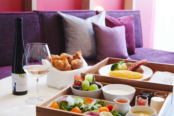翌日の朝食はゆったりとした時間を過ごせるよう、インルームダイニングで用意します。野菜をふんだんに使ったサラダに加え、パン、フルーツ、オムレツ、ヨーグルトなどを数種類のコンディメントとともに、木箱に入れて提供します。野菜やフルーツをメインにした、爽やかな朝にぴったりの朝食に仕上げました。客室内に用意したワインとともに味わうのもおすすめです。