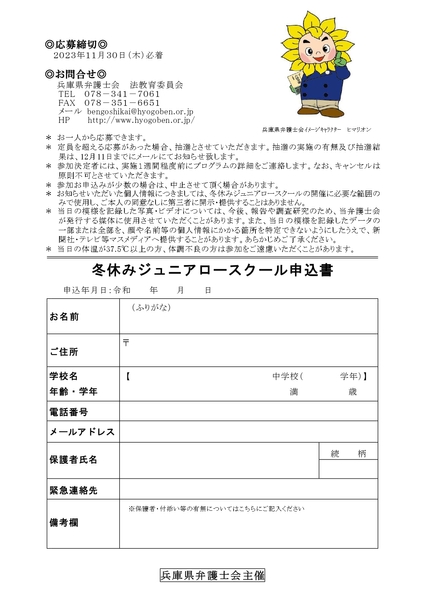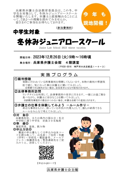 【兵庫県弁護士会主催】中学生対象「冬休みジュニアロースクール」のご案内(2023年12月26日(火))