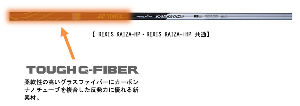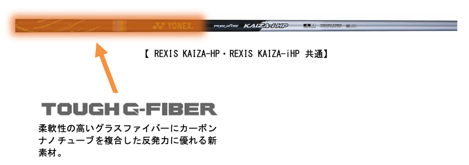 REXIS KAIZAシリーズのテクノロジーとして、カーボンの約3倍の柔軟性を持つ弊社独自素材「TOUGH G-FIBER(タフジーファイバー)」を硬くなりがちな手元側に搭載することにより、自然な粘り感を実現しました。