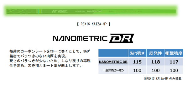 ウッド用「REXIS KAIZA-HP」には、シャフト全体にマルチレイヤードワインディング製法を採用することで、均一なしなり戻りが再現性を高め、ミート率と方向性を高めます。また、カーボン素材「ナノメトリックDR(ディーアール)※」を複合し、粘り強さと反発性を向上させました。