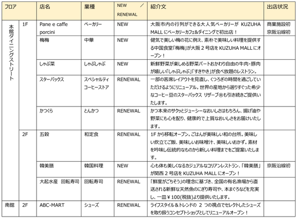 株式会社京阪流通システムズ(本社:大阪市中央区、代表取締役社長:松下靖)が運営する京阪電車 樟葉駅に隣接のショッピングモールKUZUHA MALL(大阪府枚方市楠葉花園町15-1)では、2023年春より1年間かけて段階的にリニューアルを実施してきました。