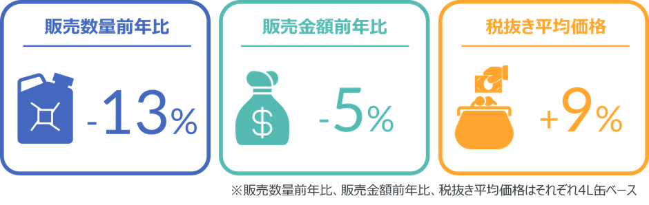 2024年2月の自動車用エンジンオイル販売は、販売量(リットル換算)ベースで前年比13%増と好調であった。ただ、4L缶の販売は数量前年比13%減と不調で、店頭が同12%減、インターネットでは同23%減と大幅に前年を割り込んだ。4L缶の粘度別にみると、最も販売量の多い0W-20は数量前年比9%減に留まったものの、5W-30が同15%減、5W-40が同30%減と大幅な減少となった。4L缶の税抜き平均価格は4,224円と前年同月から9%上昇し、店頭では10%、インターネットでは4%上昇した。4L缶全体の金額前年比は5%減となり、店頭では3%減、インターネットでは20%減であった。