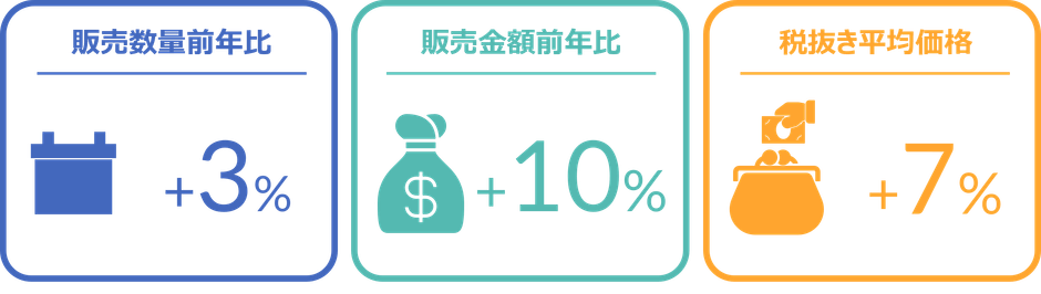 2024年2月の自動車用バッテリー販売は数量前年比3%増と微増で、店頭では1%増、インターネットでは7%増となった。D26が数量前年比17%増、B20が同15%増と全体をけん引した。またEN規格のバッテリーは数量前年比5%増で、店頭では同33%増と著しい伸長を見せた。バッテリー全体の平均価格は前年同月から7%上昇し13,560円となり、店頭では10%、インターネットでは2%上昇した。これにより金額前年比では10%増と二桁成長を示した。店頭の金額前年比は11%増、インターネットでは8%増であった。