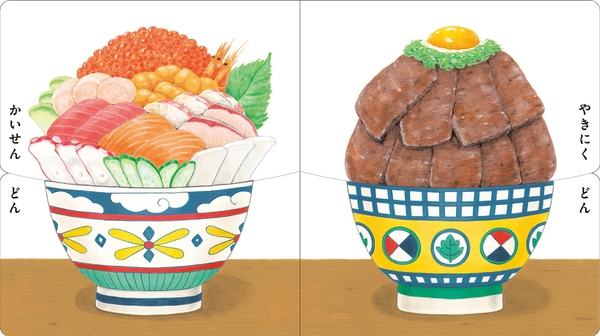 かいせんどんに、やきにくどん、ひんやりおいしいほっきょくフラッペ! だるまにこけし、ひとつめこぞう・・・あれあれ・・・!? 上と下を別々にめくると、どんどんおかしなものができてくる! どんどんめくって、わっしょい! さいごはぴーひゃら、どんどん、たのしいお祭り!!
