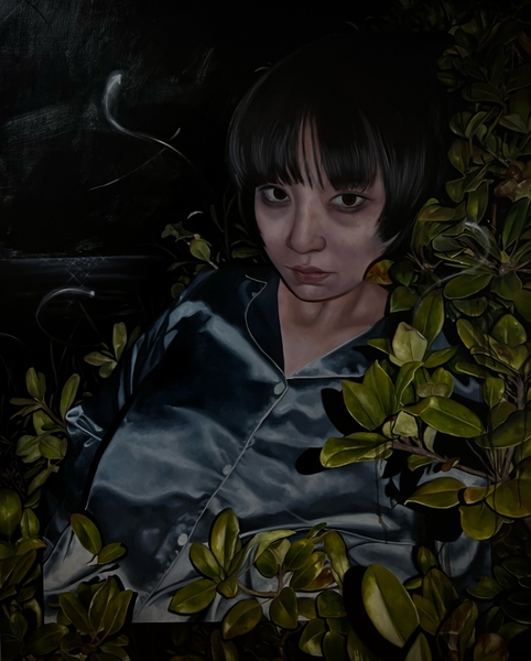 彼女が描くのはいわゆる「見られる表情」ではない、ごく私的でドメスティックな瞬間にある若い女性たちです。その表情やしぐさは、「見る対象」として消費される危うさ、あるいは無意識に自らその役割を受け入れようとする葛藤を内包し、画面に緊張感を与えます。更に、写真のフラッシュのような光の演出が、写実的表現をさらに際立たせ、描かれる人物の存在感と心理的距離感を浮き彫りしている技術も見所の一つです。