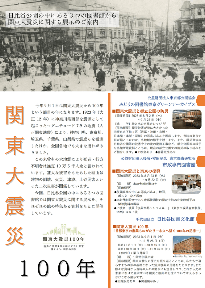 今回のフェアを通して、3つの専門図書館がそれぞれの専門領域の視点から関東大震災や防災に関する書籍をご紹介いたします。