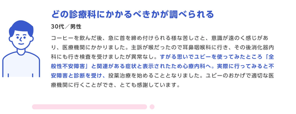 「ユビ―」は、生活者の適切な医療へのかかり方をサポートする受診支援サービスです。アプリ・Webから気になる症状について20問ほどの質問に回答するだけで、その症状に関連する病名とその病気についての詳細な情報、近隣の医療機関を誰でも無料で調べることができます。大病院をはじめとした数多くの医療現場で使われているサービス「ユビーメディカルナビ」のAI問診機能を応用し開発したもので、新型コロナウイルス感染症(COVID-19)による受診控えの深刻化が問題となった2020年4月に緊急提供を開始しました。