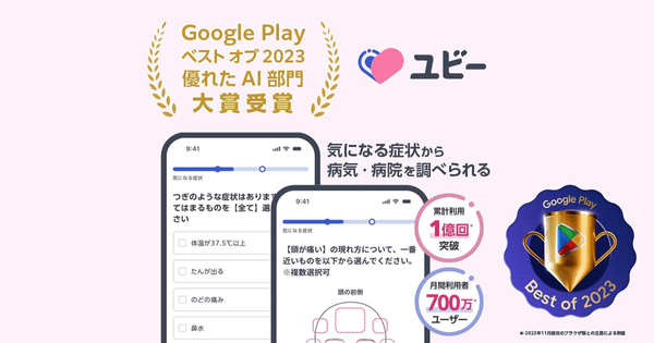 Ubie株式会社(本社:東京都中央区、共同代表取締役:阿部吉倫・久保恒太、以下「当社」)は、Google Play が主催する「Google Play ベスト オブ 2023」において、生活者の適切な医療へのかかり方をサポートする受診支援サービス「ユビー(https://ubie.app/)」が、「優れた AI 部門」の大賞を受賞したことをお知らせいたします。