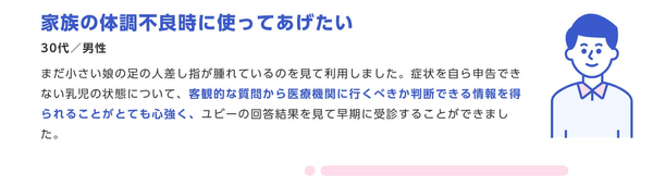 2020年にサービスの提供を開始した「ユビー」の累計利用回数は1億回を超え、また、これまでに日本国民のおよそ10人に1人である1000万人の方がサービスを利用後、実際に医療機関を受診したと推計されるなど、生活者の皆様と医療の距離を近づける一助となっています。今後もより一層皆さまに満足いただけるようなサービスをさらに拡充し、成長を続けてまいります。