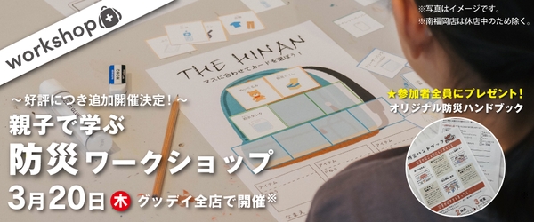 北部九州・山口等に60店舗以上のホームセンター「グッデイ」を運営する株式会社グッデイ (代表:柳瀬隆志 本社:福岡市中央区) は、2025年3月20日(木・祝)に『親子で学ぶ防災ワークショップ』を開催します。