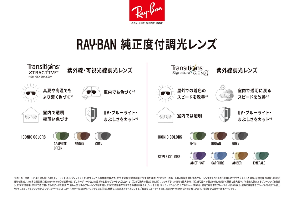 紫外線もしくは可視光線に当たるとレンズ色が変化する調光レンズで、レイバン従来の調光レンズよりも優れた反応・復元速度で光に適応することで鮮明な快適さと目の保護を提供し、スタイリッシュさと最適な視野の両方を叶える革新的なレンズです。