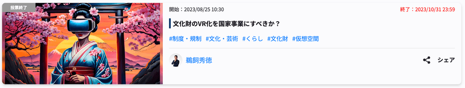 特に地震や台風などの災害の多いわが国において、デジタルアーカイブによる「保存」は急務となっていることから、鵜飼氏は文化財のVR化を国家プロジェクトとして行うべきか?みんなの意見を聞くためにイシューを作りました。