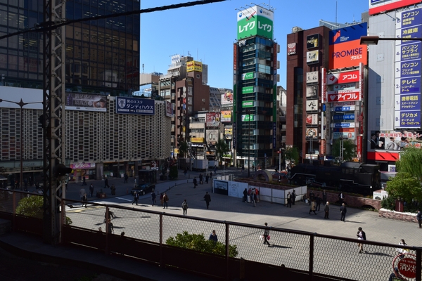 JRの鉄路を挟んで、東口は最先端のインテリジェントビル群、西口は昭和40年代で時が止まったかのような赤提灯街。