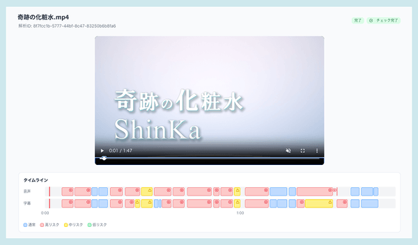 本サービスは、薬機法・景品表示法・健康増進法などの広告規制に準拠した動画表現チェックを、誰でも簡単・スピーディーに実行できるAIツールです。