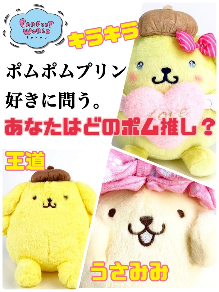 全ポムポムプリン好きに送るクエスチョン。王道可愛い・おめめウルウルキラキラ・うさみみ、あなたならどのポムポムプリンを選ぶ?1分以内に考えてみて!