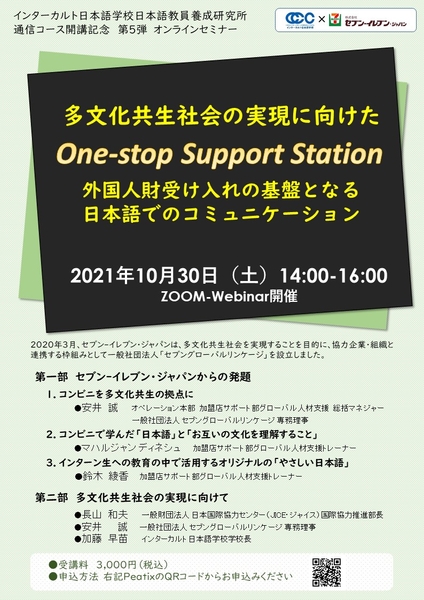 10月30日(土) 『多文化共生社会の実現に向けたOne-stop Support Station 外国人財受け入れの基盤となる日本語でのコミュニケーション』(株式会社セブン-イレブン・ジャパン・インターカルト日本語学校 共催)