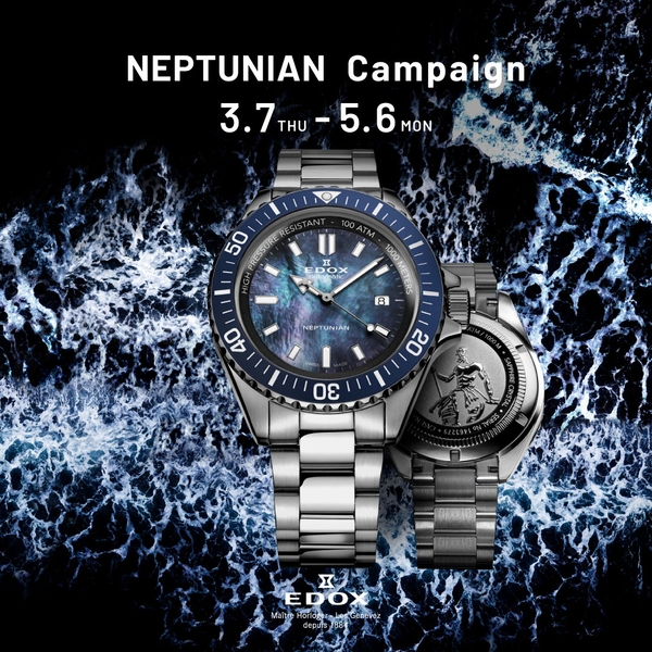 スイス高級時計ブランド EDOX(エドックス)が、3月7日(木)より「ネプチュニアン キャンペーン」を開催。期間中に対象コレクションをご購入いただいたお客様に、エドックス ビーチタオルをプレゼントいたします。また、本キャンペーン開催と同時に、日本限定『ネプチュニアン オートマティック』を発売いたします。