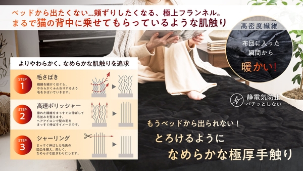 3段階の加工工程で、繊維1本1本を丁寧に整えた高密度フランネル生地を採用。ふんわり柔らかく、布団に入った瞬間からうっとりするような心地よさを感じられます。静電気防止加工でパチパチせず、ずっと触れていたくなる贅沢なぬくもりを実現しました。