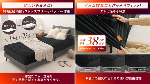 敷きパッドとボックスシーツを一体化することでズレを防ぎ、装着も簡単に。最大38cm厚のマットレスまで対応し、どんな寝具にもぴったりフィットします。丸洗いOKで乾燥も早く、洗濯回数が減るため家事の負担も軽減。小さなお子様やペットがいるご家庭でも安心してお使いいただけます。