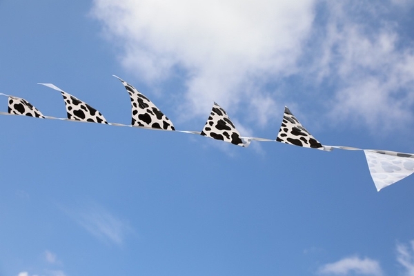 牛柄のフラッグが青空に映え、会場を盛り上げます。