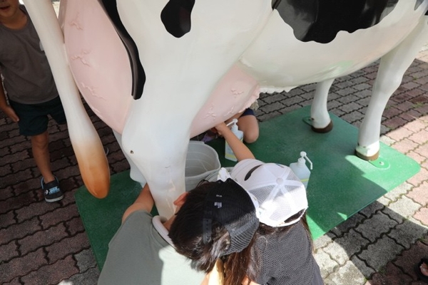 本物そっくりの模擬牛を使って乳しぼりを体験。子どもから大人まで楽しみながら酪農を学べます。