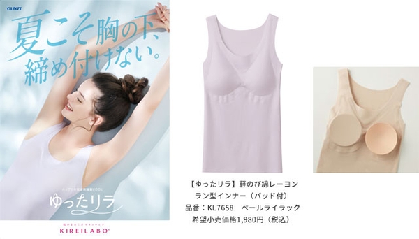 グンゼ株式会社(本社:大阪市北区、社長:佐口 敏康)は、レディスインナーブランド「KIREILABO(キレイラボ)」のカップ付きインナー「ゆったリラ」シリーズから、ひんやり涼しくやわらかい肌ざわりの「軽のび綿レーヨン」グループを2022年4月から発売しました。