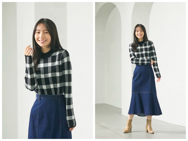 チェックジャカードのハイネックニットは、ウィンドウペンチェックが目を惹くデザイン。また、マーメイドシルエットのスカートは、落ち感と光沢感があり、大人カジュアルな印象に仕上げてくれます。ラフに楽しみたい女子会におすすめ!