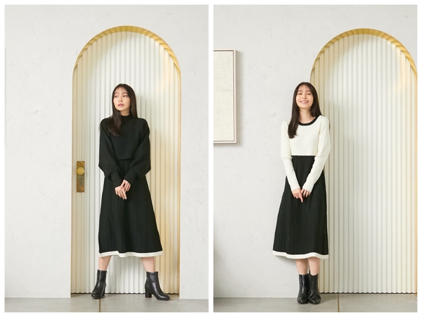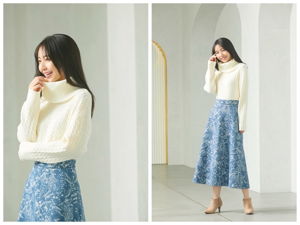 オフタートルにケーブル編みがオーセンティックなニットプルオーバーや、ボタニカルジャカードが目を引くAラインフレアスカート、マルチウェイで使える、短丈トップスとニットワンピースがセットになったニットアップなども展開いたします。