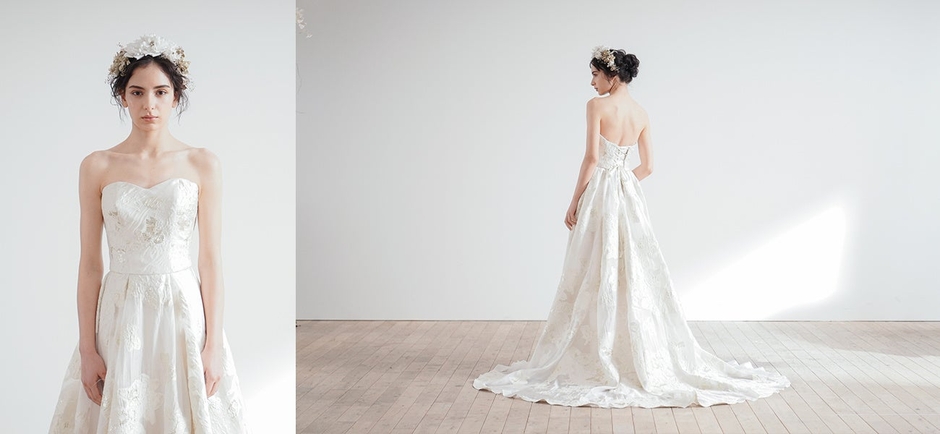 又、レースの美しさや素材の質感も撮影時にお楽しみいただけるよう、インポートものの上質な素材のレースを用い、くるみボタンやパールのモチーフとの組み合わせ、配置にも工夫を施すなど、ディテールもこだわり抜いたラインアップとなっております。
