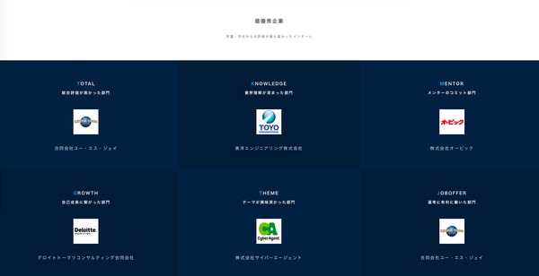 また、メンター部門で高評価を得た企業の多くにおいて、1グループに1名以上のメンター社員がつきました。メンター社員から「実際に本当の社員に接するかのようなレベルで真摯にフィードバックをもらえたと感じた」という声や、「インターン後に個別で一人ひとりにフィードバックがあった」といった声もあり、《フィードバックの厳しさと親身さ》が評価されたポイントとなりました。