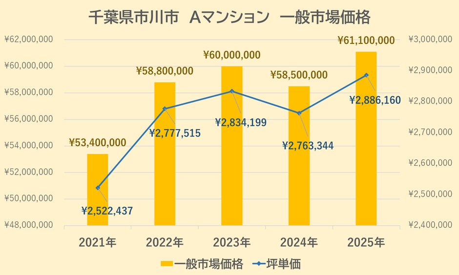 Aマンションの一般市場価格・坪単価の推移は上記【図3】の通りです。