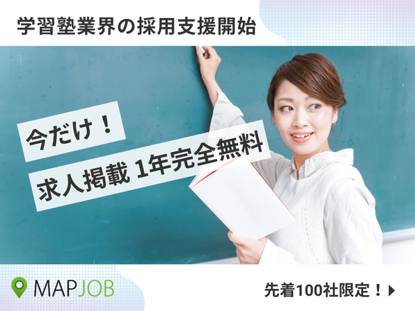 こうした背景から、マイスター株式会社は学習塾業界の採用活動を全面的にサポートすべく、地図から探せる求人サイト「MAPJOB」への求人掲載費用を1年間完全無料とする特別キャンペーンを企画。先着100社限定で、掲載料、応募時、入社時の費用がすべて無料となり、学習塾の経営者が採用コストを気にせず人材確保に取り組める環境を提供します。