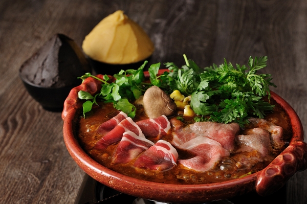 柔らかな肉質の牛肉と里山ならではの猪肉を、栃木県らしい味噌仕立てで提供します。味噌で煮込むことで、和牛のコクと旨味が全体に沁み渡ります。味噌の香ばしい香りも食欲をそそります。