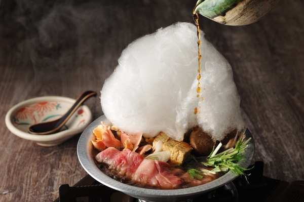 ふわふわの綿あめを、アルプスの山々に降り積もった雪に見立てて素材の上にのせた「雪鍋」。上から割下をかけると、まるで春の雪解けのように綿あめがすっと溶けて、牛肉と野菜が顔を出します。綿あめのまろやかな甘みが出汁に浸透し、素材の旨味を引き出します。目でも舌でも楽しめる鍋です。