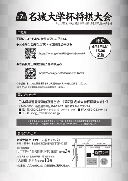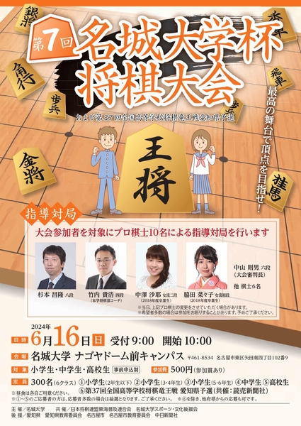2024年6月16日(日)に名城大学ナゴヤドーム前キャンパスで、「第7回名城大学杯将棋大会」を開催します。対象は小学生から高校生まで、募集定員は300名で、「第37回全国高等学校将棋竜王戦愛知県予選」も併せて開催されます。