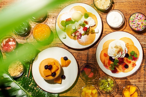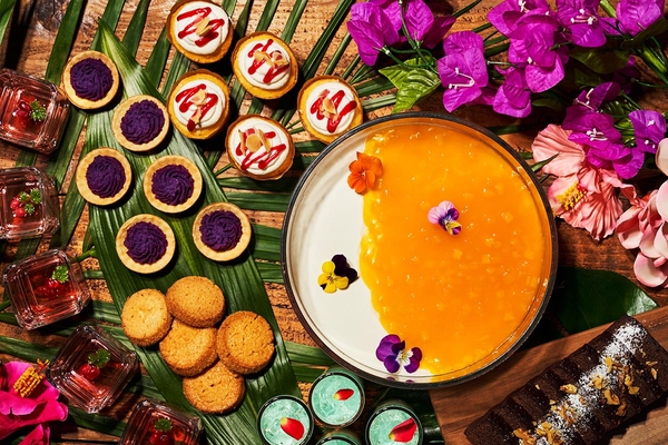 ココナッツプリン マンゴーソース、紫芋のプチタルト、ヨーグルトムースとラムネのジュレ仕立てなどのカラフルなスイーツをはじめ、オリジナルのトッピングを楽しめるパンケーキコーナーなど盛りだくさん。ミルクムースとフルーツを閉じ込めたレインボーシェイブアイス“’Anuenue-アヌエヌエ(ハワイの虹)”は、自由にカスタマイズしてお楽しみいただけます。