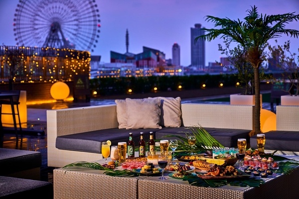 レストランのエントランスには、ハワイのフラをイメージしたドレスツリーとフォトスポットがお出迎え。ハワイアンミュージックが流れる店内は、まるで海外のビーチサイドレストランのような雰囲気に包まれます。リーベルホテル自慢の広大なテラスの目の前には大阪ベイエリアの夜景が一面に広がります。開放感抜群のテラス席は、