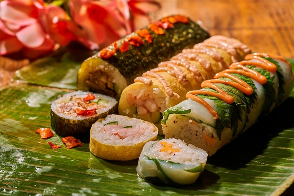 カリフォルニアロールに見立てたカラフル寿司は、リーベル風にアレンジし、豚生姜焼きときゅうりのロール寿司・イカと大葉のロール寿司など3種類の味をお楽しみいただけます。