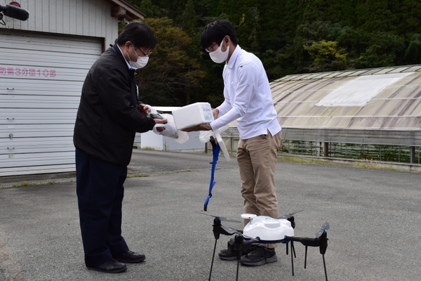 本実証実験では、第1回目の実証を10月20日に実施し、その際は現在町民向けの買い物支援事業として運営されている移動販売車「きよら号」での配送をドローンに置き換えた場合を想定し、ドローンを活用しての食材等の配送を行いました。