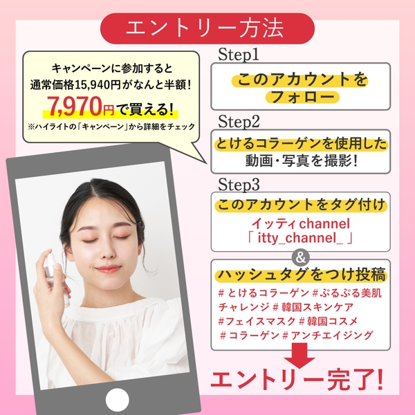 ④ハッシュタグ「#とけるコラーゲン」「#ぷるぷる美肌チャレンジ」「#韓国スキンケア」「#フェイスマスク」「#韓国コスメ」「#コラーゲン」「#アンチエイジング」を記載し、イッティchannel l(@itty_channel_)をタグ付けして投稿