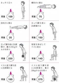 腰痛は日頃の習慣が生みだす「生活習慣病」ともいえます。そうでなければ、同じ重いものを持っても腰痛になる人とならない人がいる理由がわかりません。まっすぐ立ったときに腰にかかる負担を基準に、日常の姿勢によって腰にかかる負担を比較してみましょう。