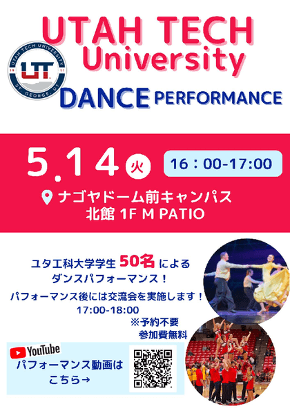 2024年5月7日 18:005月14日(火)に天白キャンパス・ナゴヤドーム前キャンパスで、協定校であるアメリカのユタ工科大学学生約50名によるダンスパフォーマンスを開催します。