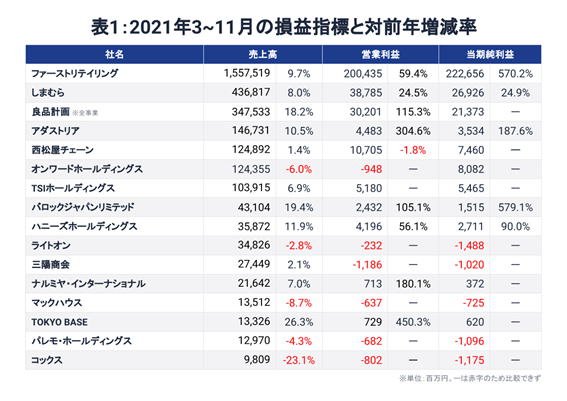 本稿の調査対象は2月期・5月期・8月期決算の主要アパレル企業16社の2021年3~11月における決算。決算短信を基に売上高、営業損益、当期純損益をまとめたのが表1だ。